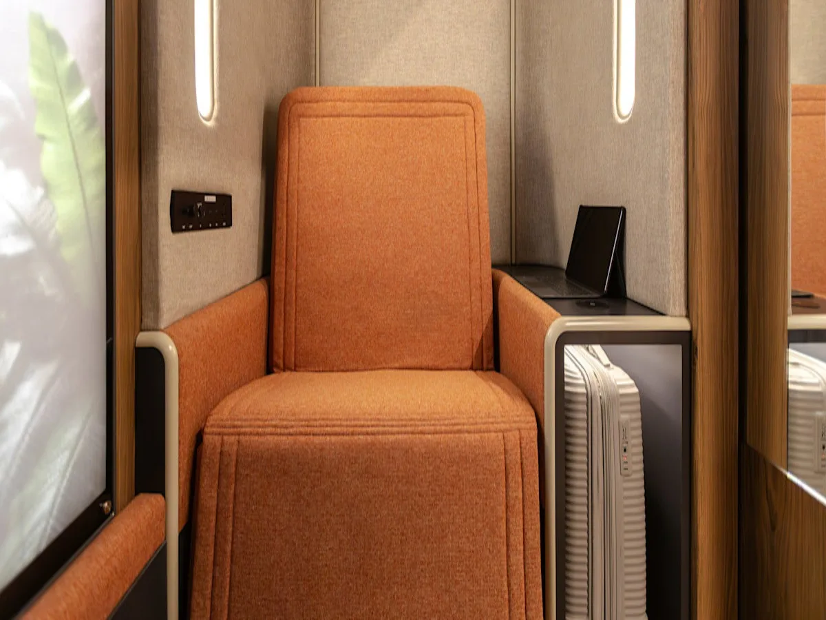 An enclosed pod, a fully reclinable seat, or a cabin.