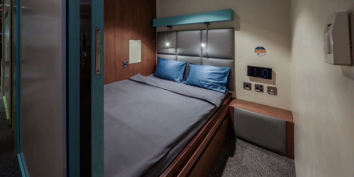 A sleeping pod with space for two. Our cosy, private cabin has everything you need to drift off.